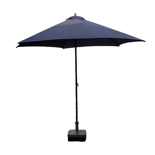 Deze zeshoekige blauwe parasol wordt geleverd met een voet die gevuld dient te worden met water.